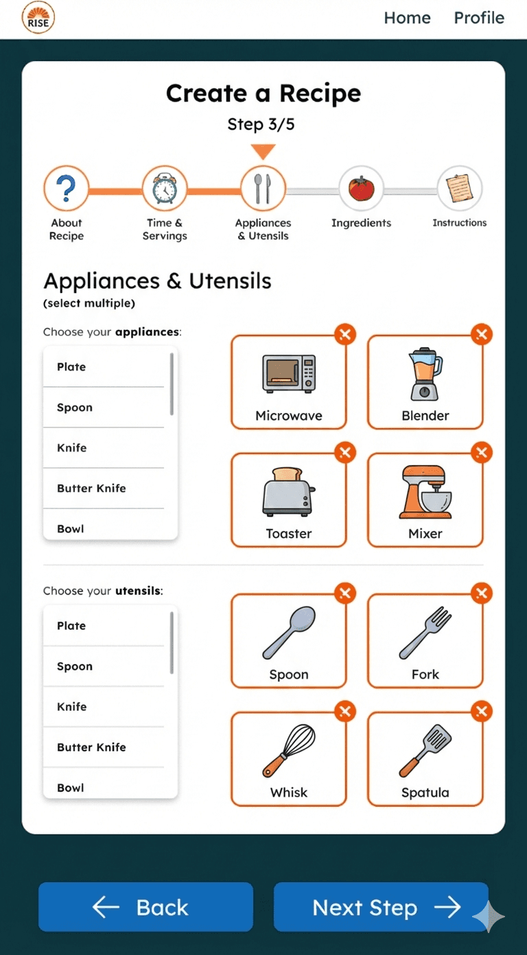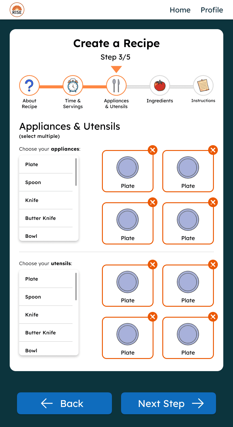 I proposed designing the experience so participants could also add their own recipes with support from staff or guardians. This aligned with Rise DC’s mission of fostering independence and created a shared experience usable by both staff and participants.