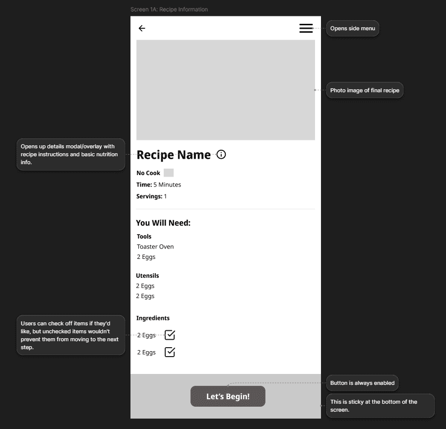 Since listing all recipe steps on one page was causing confusion and overload, I designed an interactive, step-by-step recipe tutorial that guides users through cooking one action at a time.