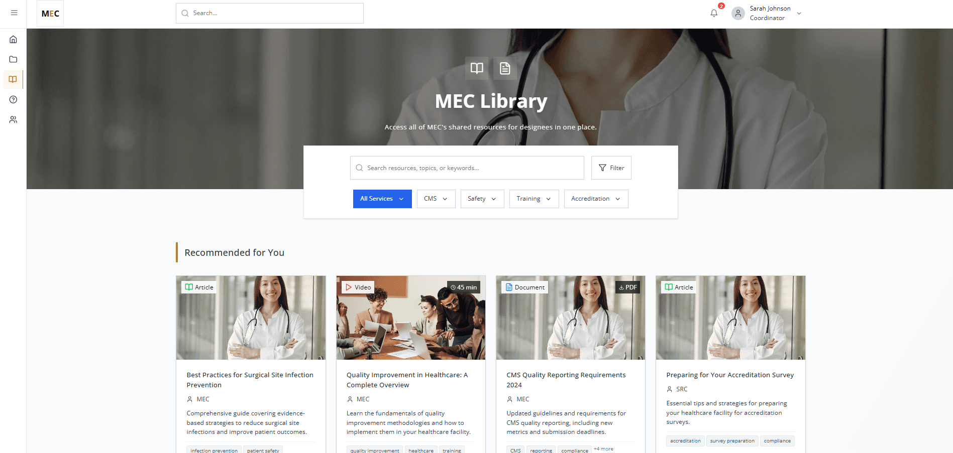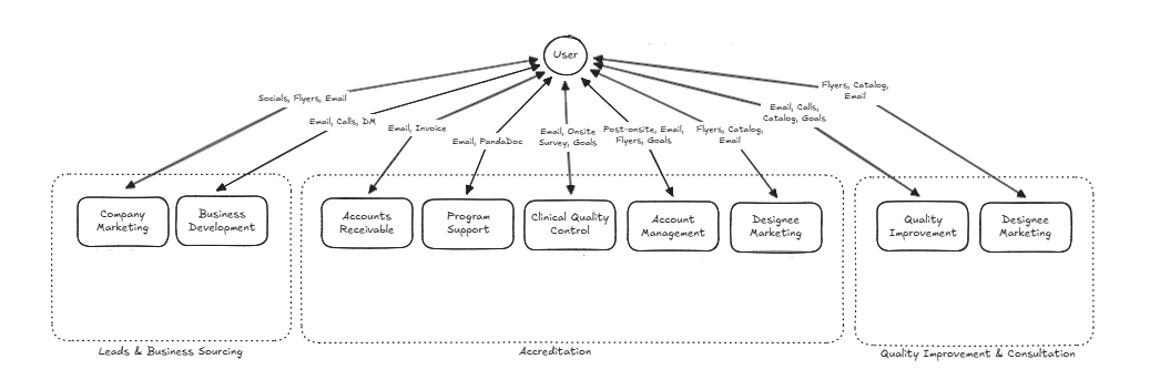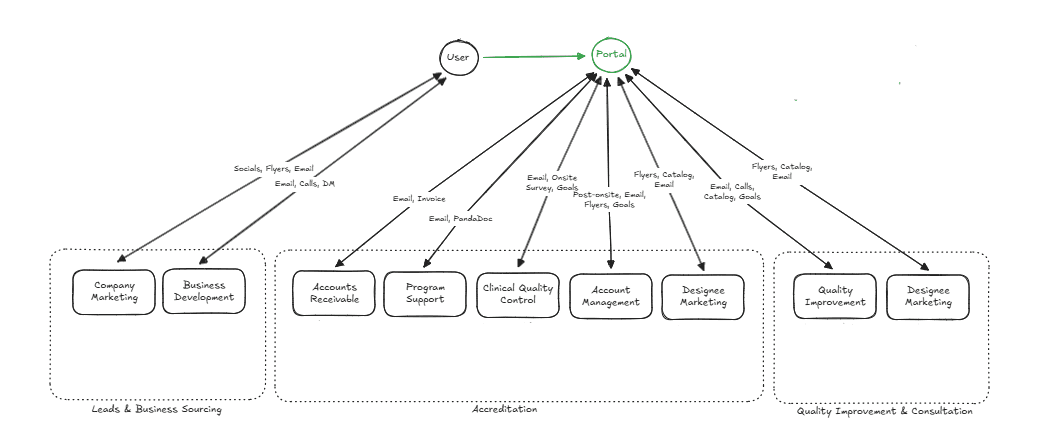 Our users include internal employees as well as clients like hospital staff and faculty (designees) who must coordinate through multiple conversations and systems to achieve accreditation.