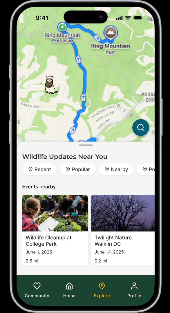Play4Nature is a mobile app that connects people with local wildlife conservation efforts through gamified experiences. By offering location-based recommendations for donations, conservation news, volunteer opportunities, and rewarding actions, we make conservation engaging, accessible, and impactful.