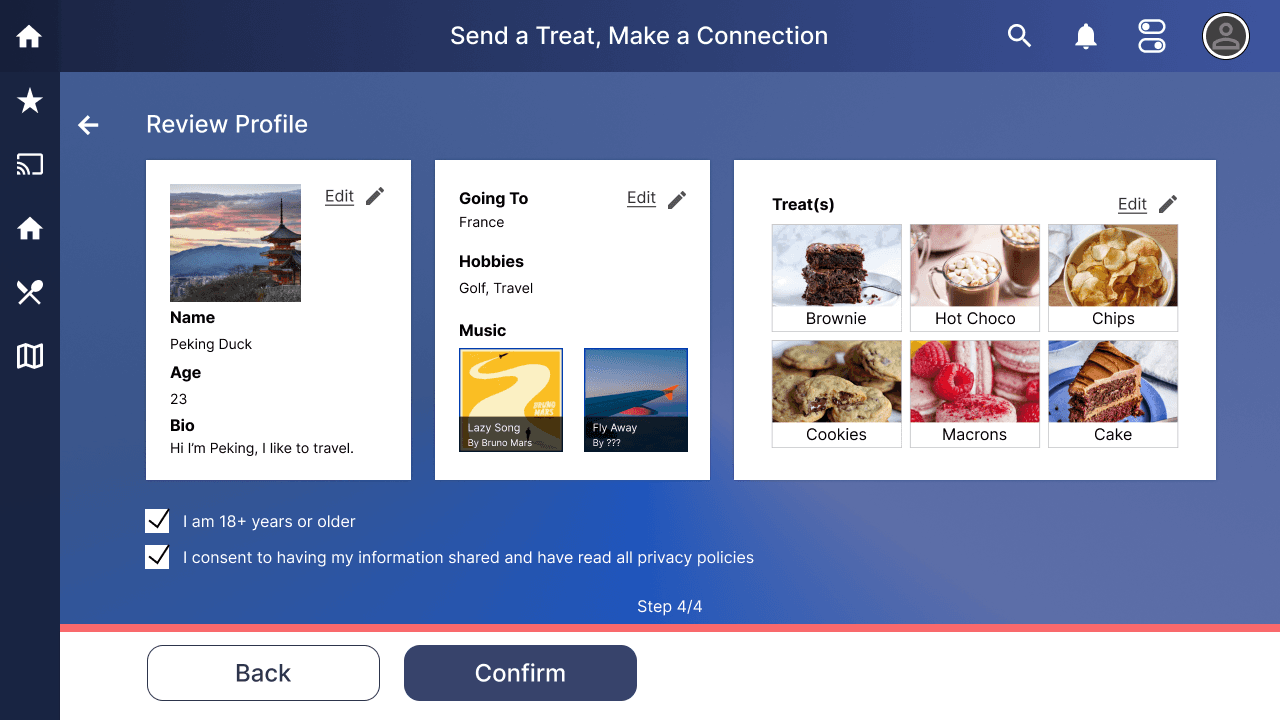 From the third user testing, I received feedback to include users' age since that might be an important factor in passengers wanting to connect with others. I also iterated on one of the modal screens and put the option to send a treat back to the person who treated you below the notes section.
