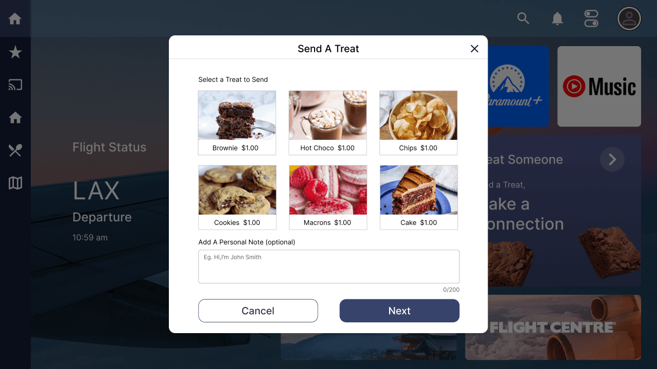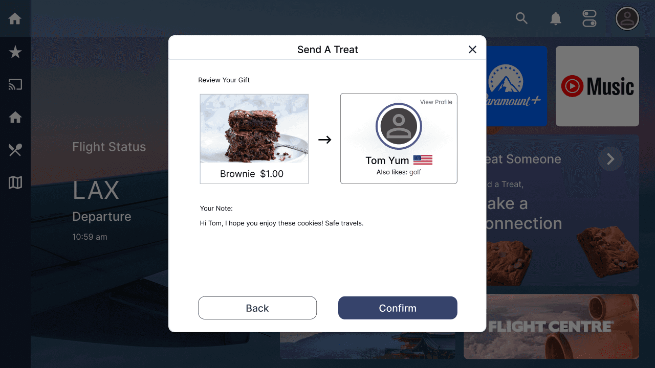 I selected the airplane treats idea for its simple, gesture-based interaction: passengers can gift snacks, drinks, or thank-yous through the in-flight app, inspired by the “pay it forward” trend at drive-thrus.
